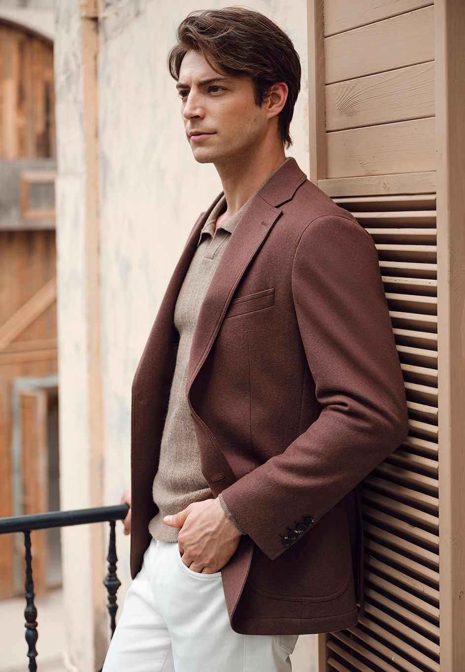 這款西裝采用平駁頭、單排兩粒扣設計,搭配上手巾兜與下貼兜,整體線條利落。周身以雙明線勾勒,簡約而不失細節;無胸襯、無墊肩的設計,更顯輕盈隨性,貼合身形。內里采用半里襯工藝,配合擼沿條設計,提升穿著舒適度與自由度。袖口裝飾四粒袖扣,平行鎖眼,于低調中彰顯精致質感。