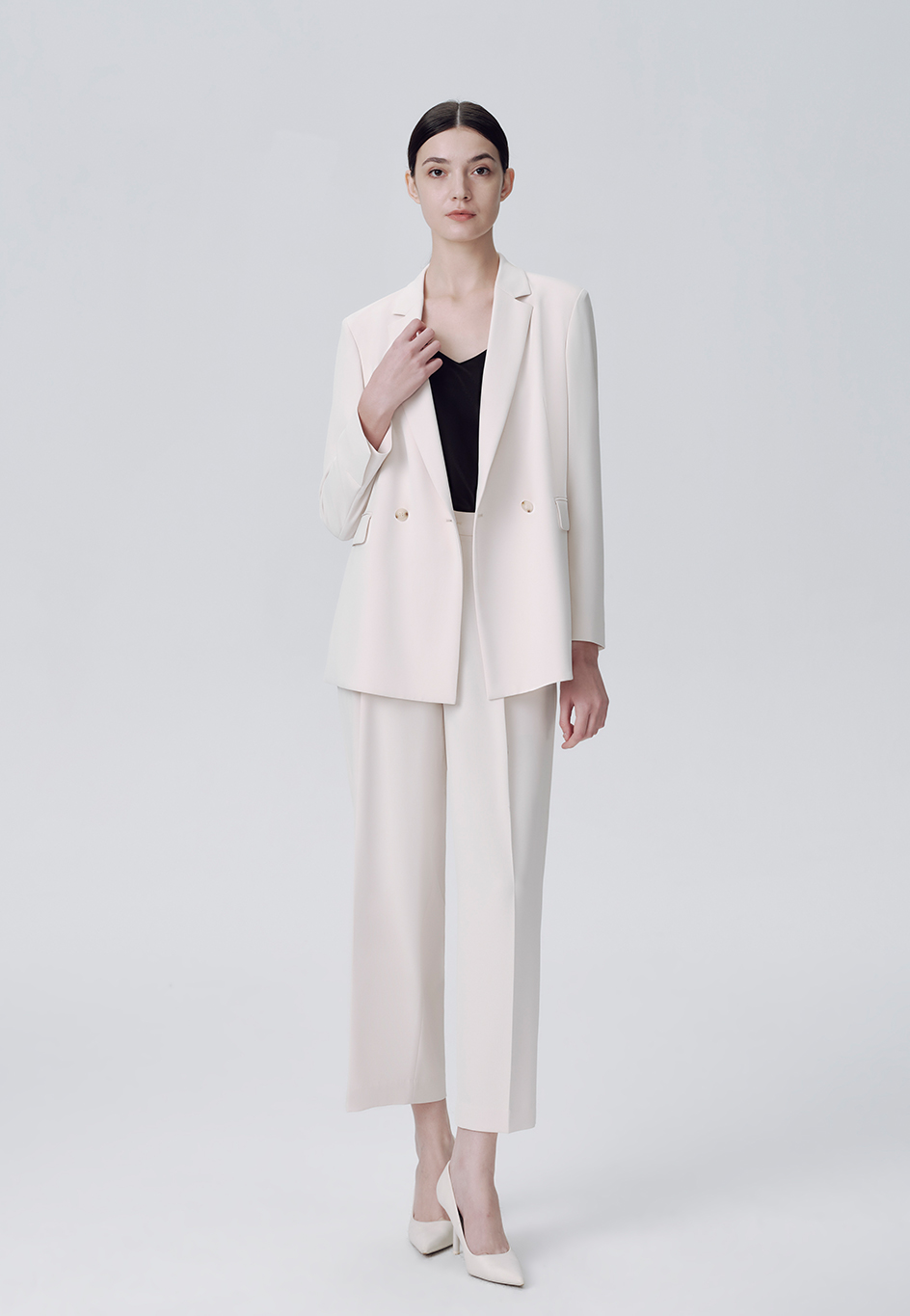 平駁領(lǐng)西裝,雙排搭門共二粒扣,內(nèi)釘一粒拉扣,直角下擺,雙開線袋蓋口袋,活袖開祺,雙后開祺,無內(nèi)里,下身搭配大筒褲。