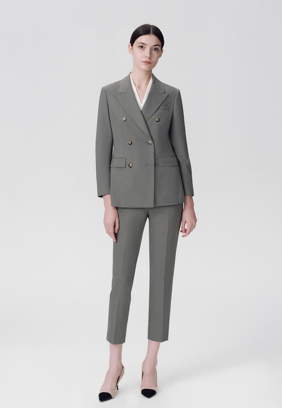 戧駁領西裝,雙排搭門共六粒扣,內釘一粒拉扣,直角下擺,雙開線袋蓋口袋,手巾袋,周身珠邊,四粒袖扣,后中開祺,下身搭配小腳褲。