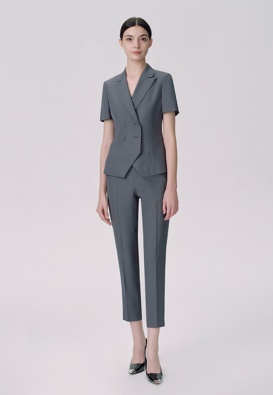 戧駁領西裝,雙排搭門共四粒包扣,內釘一粒拉扣,斜下擺,袖口開衩,半里工藝,下身搭配小腳褲。