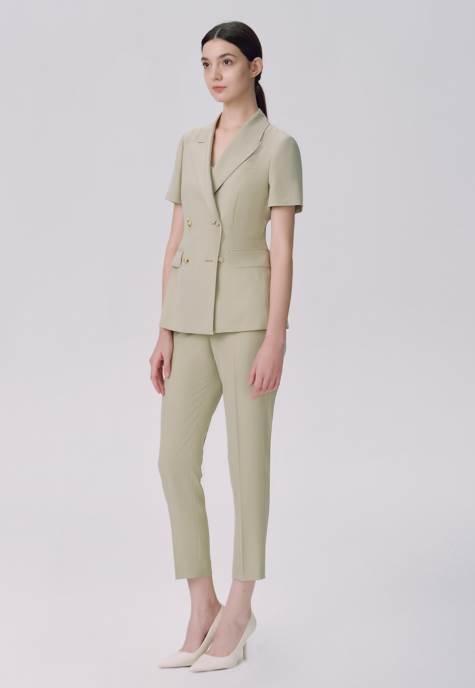 戧駁領西裝,雙排搭門共六粒扣,內釘一粒拉扣,直角下擺,雙開線袋蓋口袋,手巾袋,周身珠邊,半里工藝,后中開祺,下身搭配小腳褲。