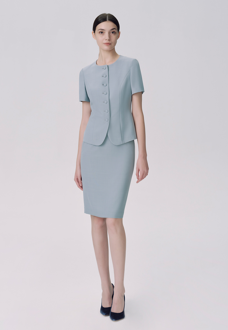 圓領,七粒包扣,圓角下擺,彎開刀剪裁,半里工藝,下身搭配半裙。