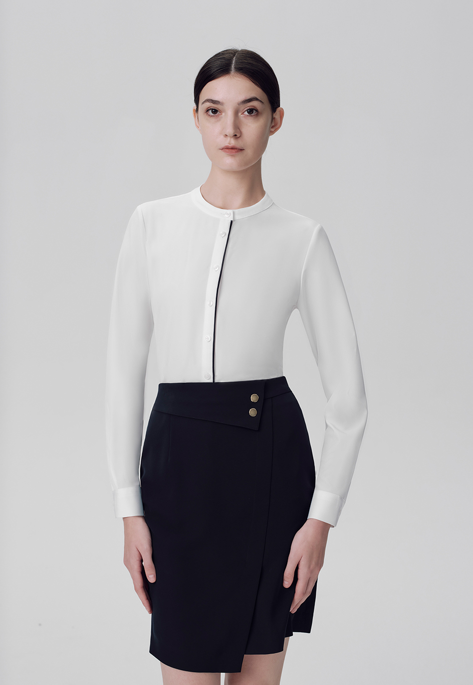 貼脖立領,明門襟,門襟有撞色裝飾沿條,寬松版型,后背有過肩,過肩下收陰褶,直角袖口一粒扣,滾邊袖衩。