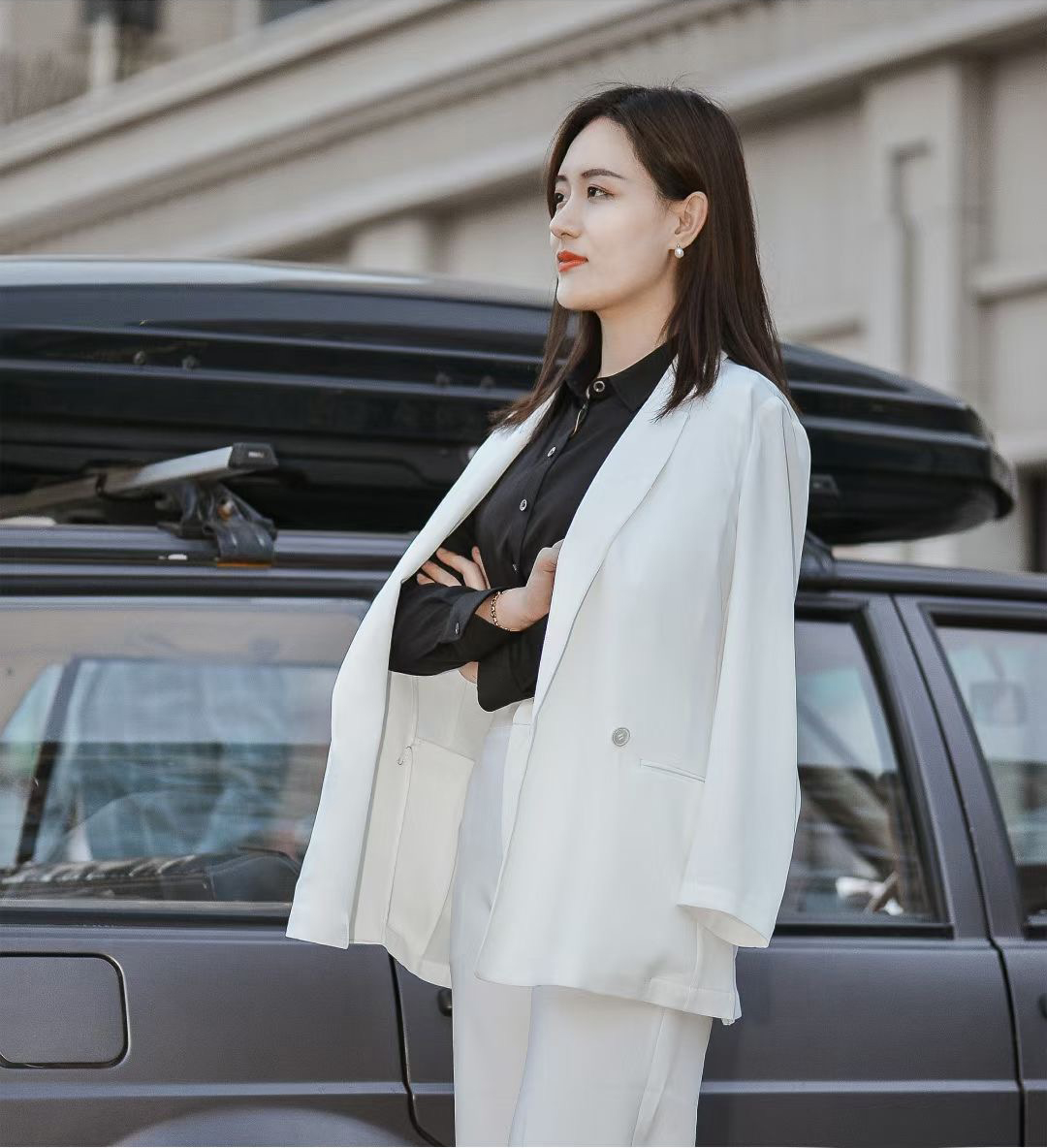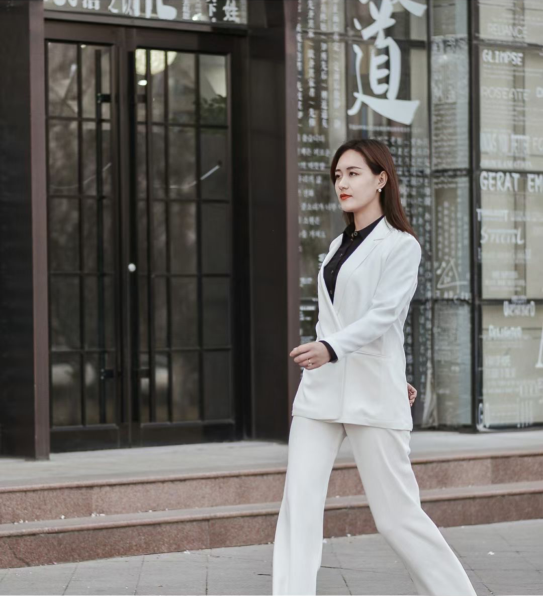 【西裝】:時(shí)尚平駁頭領(lǐng),直角下擺,貝殼扣,時(shí)尚干練;混紡織就,面料抗皺、吸濕透氣,可穿性強(qiáng),易于打理。