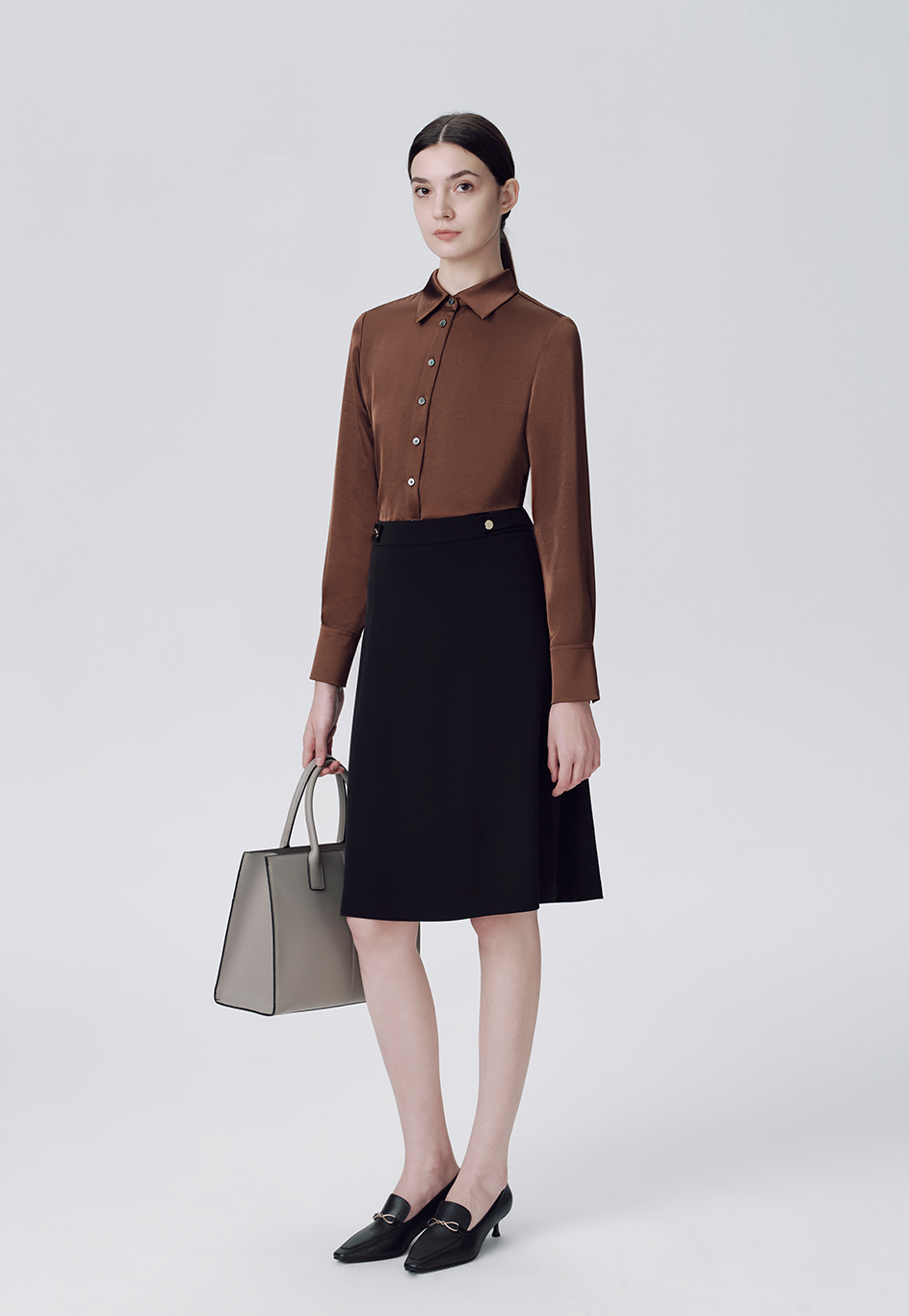 大A字裙,腰袢上釘一粒裝飾扣,后省位,后中裝隱形拉鏈。