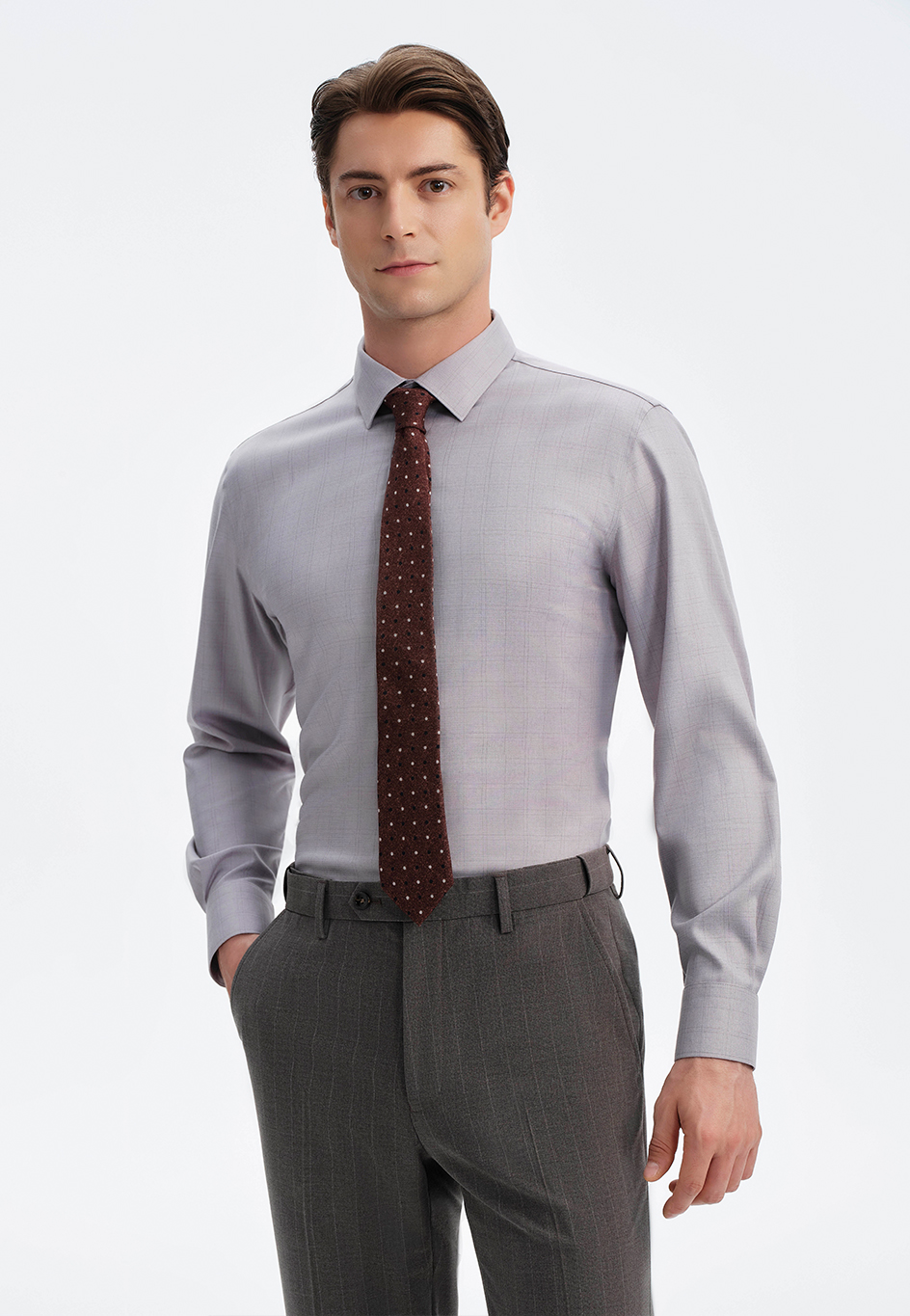 領型為6cm小方領,精致0.3明線,暗翻門襟,前胸無口袋無繡花,簡潔大方,圓角袖頭,小燕尾圓下擺。后背無省,經典版型。
