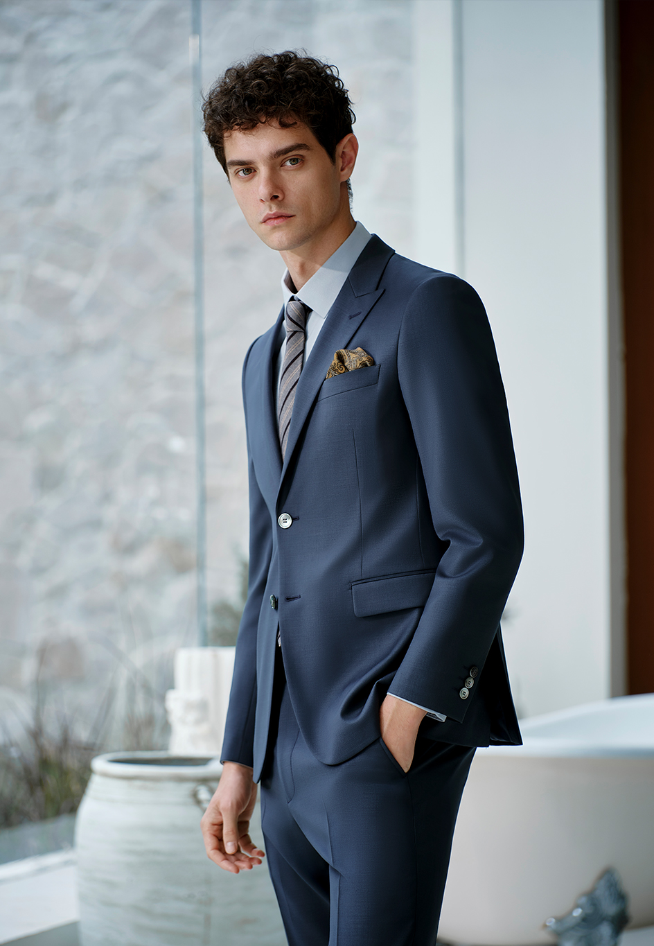 面料為半毛混紡定向開發(fā)產(chǎn)品,沉穩(wěn)、干練的低飽和度效果,匹配羊毛彈力質(zhì)地,面料光澤柔和自然、手感軟糯、抗折皺性好,穿著后合理掛裝能快速回復(fù)原有效果,輕便、舒適、易打理。