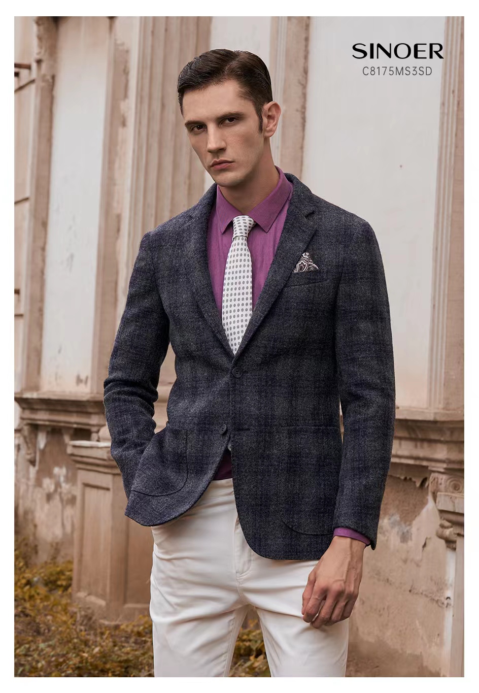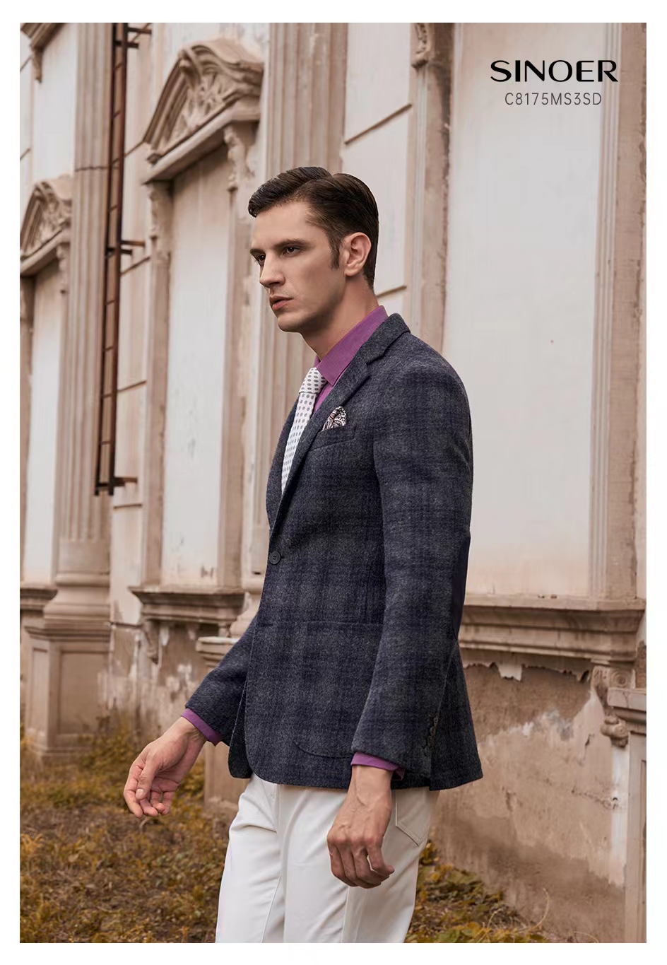平駁頭6.5公分,單排兩粒扣,下貼兜款式,袖肘處增加拼接麂皮設(shè)計,增加耐磨度、舒適性,內(nèi)里采用印花里布,更具時尚性,同色系紐扣使衣服更加和諧,穿著時美觀且具有時尚感。