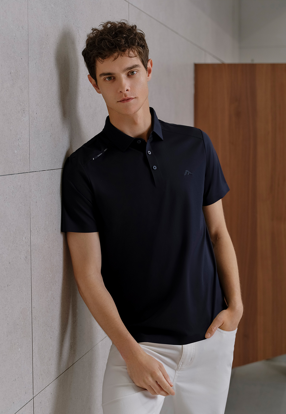 這款Polo衫,采用經(jīng)典的翻領(lǐng)設(shè)計,領(lǐng)型挺括有型,能夠很好地修飾頸部線條,使穿著者顯得精神干練。領(lǐng)口的寬度適中,既不會過于緊繃,也不會過于寬松,保證了穿著的舒適度和美觀度。領(lǐng)口處的紐扣設(shè)計簡潔大方,三顆紐扣均勻排列,可根據(jù)個人喜好選擇不同的開合程度,增添穿著的靈活性和時尚感。肩部采用獨(dú)特的拼接設(shè)計,在肩部位置添加了一條帶有紋理的裝飾條,從領(lǐng)口延伸至肩部外側(cè),不僅增強(qiáng)了肩部的立體感,還為整體造型增添了一份時尚元素,使這款Polo衫在簡約中透出一絲個性與活力,打破了純色服裝的單調(diào)感。